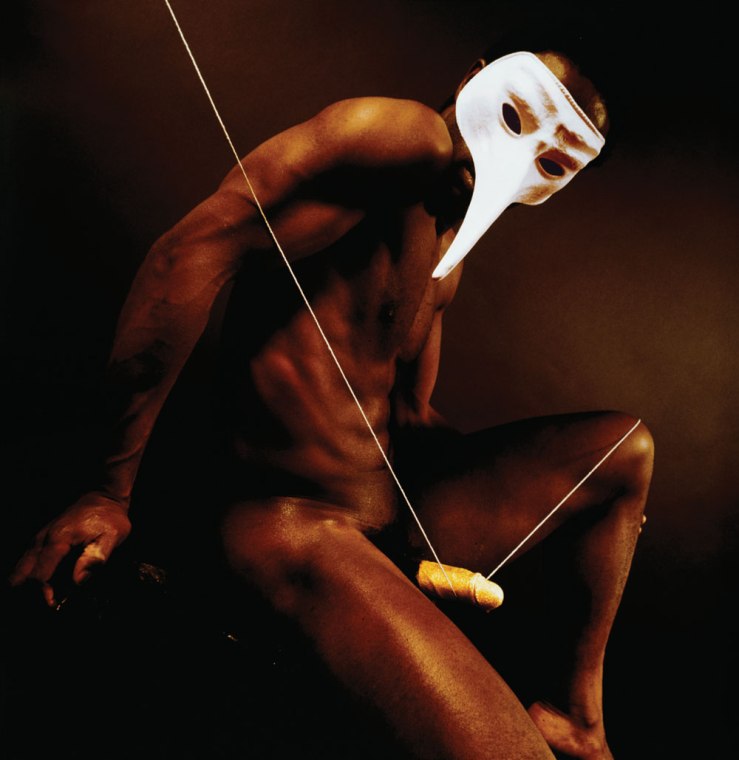 Rotimi Fani-Kayodé (1955-1989) directly referenced Black Skin, White Masks in his artist statement. “On three counts I am an outsider,” the Nigerian artist said in relation to his postcolonial position in the world.[15] “In matters of sexuality; in terms of geographical and cultural dislocation; and in the sense of not having become the sort of respectably married professional my parents might have hoped for.”[16] Born to a wealthy Yoruba family, he moved to England as a refugee from the Nigerian civil war. After his studies in fine arts and economics in the US he returned to London where he worked as an artist until his death in 1989 due to an HIV-related illness. In The Golden Phallus (1989), the artist shows an athletic Black man posing naked on a platform wearing a white beak mask and looking into the camera. His penis is gold-plated and held up with a white string. The work strangely reminds me of the controversial Lynda Benglis advertisement in Art Forum which responded to the Robert Morris photograph taken by Rosalind Krauss. Fani-Kayodé does the same in exploring Black sexuality in relation to a Black subject being gazed upon by the world. In the same manner that Benglis stood on Feminist principles, Fani-Kayodé challenges Fanon’s suggestion that male homosexuality only exists for the enjoyment of the white man by attaching the subject’s penis to a string and showing that he is not readily sexually available. Along with the mask, it signals that he will remain inscrutable and not a puppet to anyone’s desires. The work further challenges straight assumptions of homosexuality. In light of this discussion, I read it as a cogent Surrealist response.