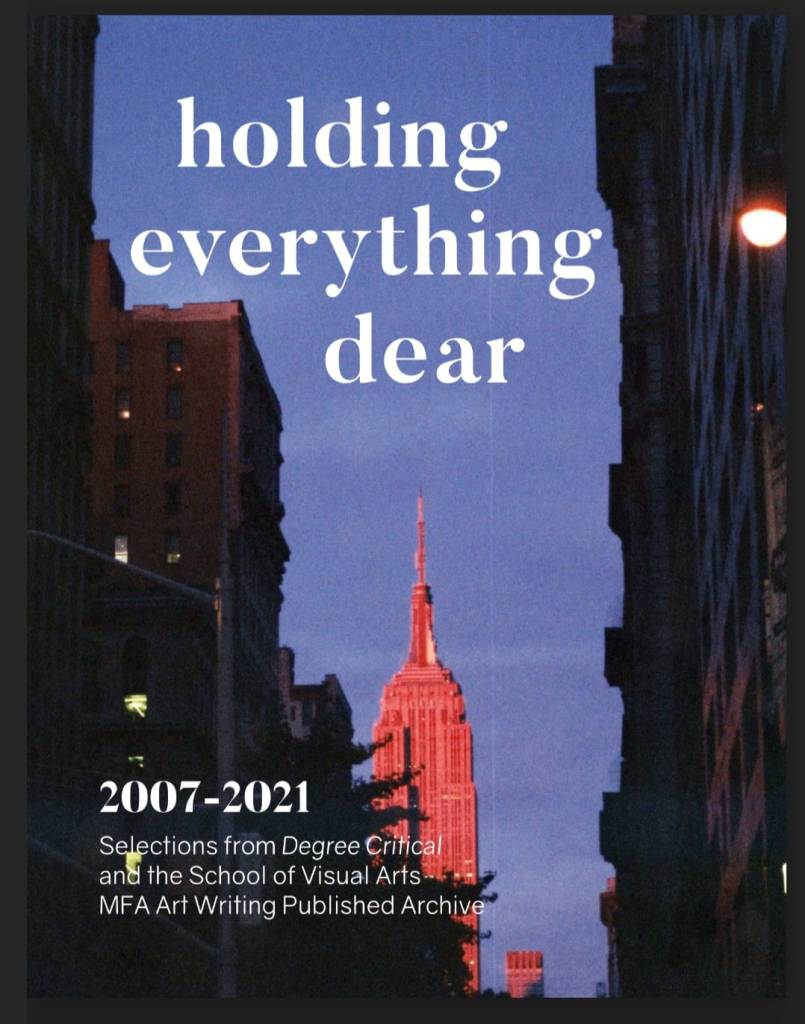 Wrote a short section introduction to Holding Everything Dear (2021), a compilation of selected writings from Degree Critical edited by Jessica Holmes, Lune Ames, and Cigdem Asatekin. Foreword by David Levi Strauss and afterword by Nancy Princenthal.