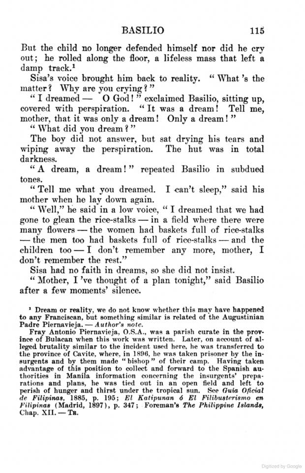 The Maria Clara is named after the mestiza heroine of José Rizal’s 1890 novel Noli Me Tangere and became a popular formal dress among elite Filipino women at the turn of the twentieth century. It remains the only national costume named after a literary character. Juan Luna, who made bocetos to illustrate the 1891 edition of Noli, further entwines the painting La Bulaqueña with Rizal’s world. That connection deepens when we consider that Emiliana’s father, the Augustinian friar Antonio Piernavieja, is widely believed to have inspired the character of Padre Salvi ( infra for biographical details). In a footnote to Chapter 17 (“Basilio”) (fig.5) of Noli Me Tangere, Rizal pointedly mentions Piernavieja including the allegations of murder and fathering an illegitimate child. Archival evidence indicates Piernaveja had three children, one of whom appears in correspondence between Juan Nakpil and Andrés Bonifacio.(11) This biographical thread situates La Bulaqueña not only within the sphere of colonial portraiture and domestic ideology, but also within the charged literary and political milieu that Rizal inhabited and sought to expose.
