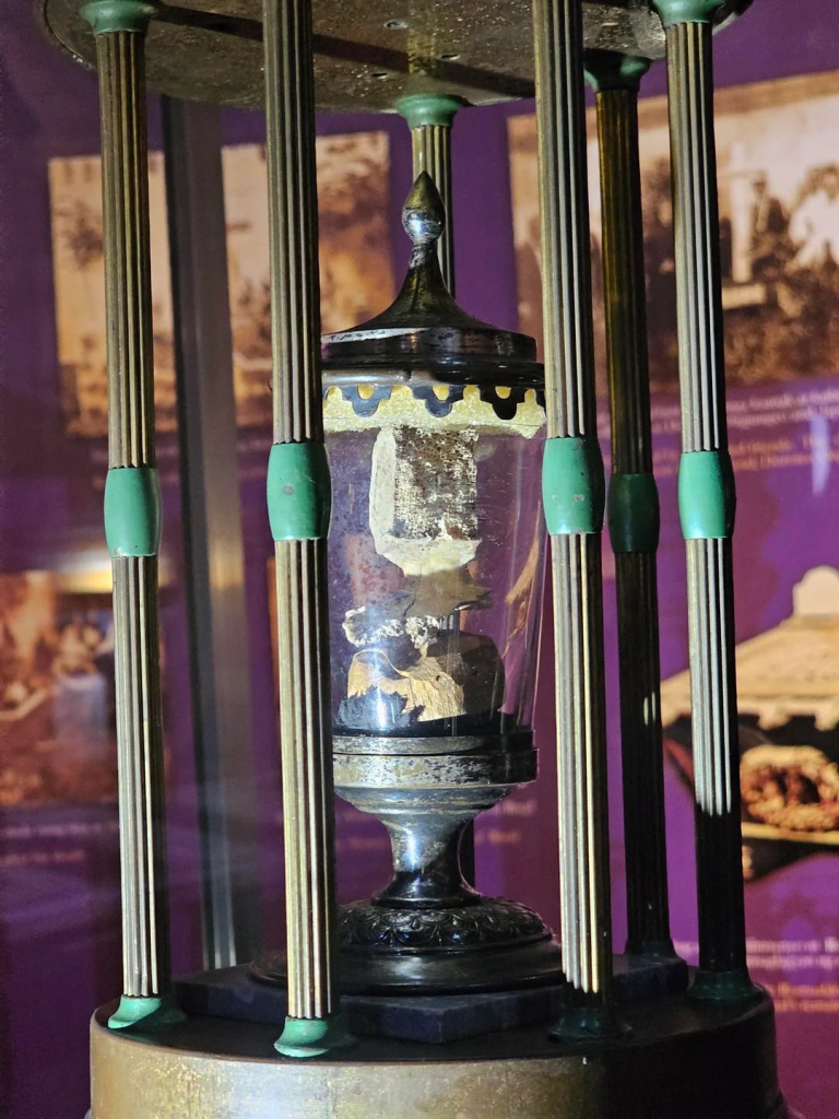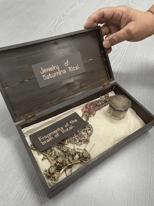 The reason Rizal’s brain was kept by his sister Saturnina (love the name!) and later donated to the Ateneo Library is easier to decode. It was placed in a jewelry box witha peineta, bodkin hairpins, ornamented with seed pearls arranged in floral motifs, alongside a rosary of coral, or glass with gilt fittings. One can imagine Saturnina and her sisters praying daily for the eternal repose of the mason Rizal’s soul and wearing the jewelry on special occasions. The aesthetics of portability in this reliquary point to the historical conditions of the time, for Rizal had no permanent resting place until 1912. Today, the reliquary is housed within its own reliquary at Fort Santiago.