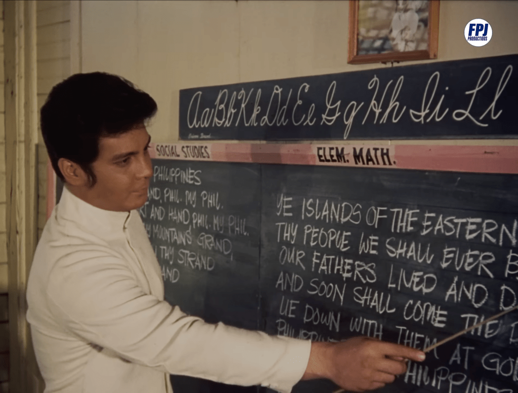 The classroom sequence foregrounds the ideological critique of colonial education, encapsulated in Asedillo’s line, “Ang pag-aaral ay hindi lamang sa pamamagitan ng libro” (“Learning does not come only from books”). This scene functions as the origin point for his later revolt; rebellion begins as pedagogy. Castillo stages it in static frames, focusing on FPJ’s composure and measured tone rather than anger, underlining that moral conviction precedes violence.