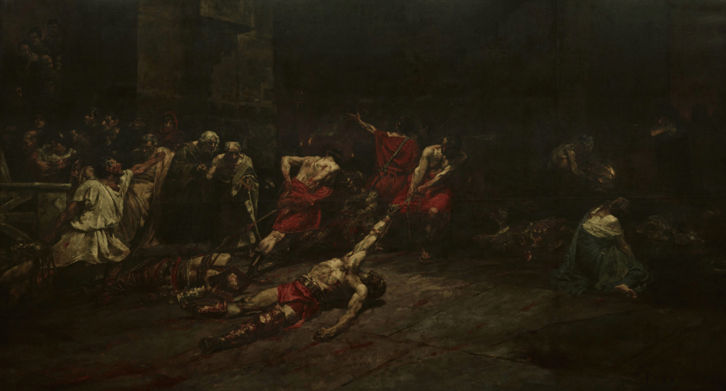 Another way to establish the connection is through a visual comparison. Jean-Léon Gérôme’s Pollice verso (1872) became one of the most influential nineteenth-century images of Roman gladiatorial spectacle. Other art historians have argued how later artists and audiences visualized the arena’s violence and choreography through this specific painting. Its combination of archaeological detail, staged aftermath, and the central motif of defeated bodies hauled across the arena floor established a compositional format that later history painters readily recognized. When Juan Luna developed Spoliarium (1884), he worked within this established academic template: the large-scale horizontal layout, focus on the removal of corpses, and reconstruction of Roman setting all resonate with the visual vocabulary Gérôme had already popularized. Gérôme’s painting thus functioned as a precedent which helps explain why Spoliarium was immediately legible to Salon audiences attuned to Gérôme’s format.
