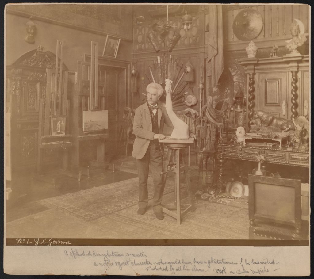 The photographs of Luna and Gérôme, themselves underscore this resonance. Luna is pictured in his studio at the Villa Dupont between 1890 and 1892, surrounded by large-scale historical canvases, Greco-Roman scenes, academic props, armour, and ethnographic objects—the visual vocabulary of an artist steeped in the narrative and archaeological language of the Salon. Gérôme, photographed in his richly appointed studio, stands beside a sculptural model, with walls crowded by Ottoman arms, classical casts, and Orientalist décor, all elements that defined both his work and the highly codified academic approach he imparted to his students. The theatrical staging of Luna’s studio interior, the archaeological props echoes Gérôme’s world more closely than earlier nationalist readings of Luna have allowed. While the photograph does not prove personal intimacy or regular instruction, the visual alignment is striking, and Frank Stokes’s organizational logic for the album (interweaving mentors, acquaintances, and admired studio-owners) strengthens the possibility that Luna and Gérôme shared more than just an artistic vocabulary.