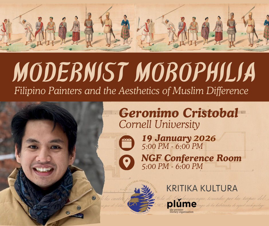 On January 19, the Literary and Cultural Studies Program, in collaboration with Kritika Kultura and PLUME, invites you to Geronimo Cristobal’s lecture, “Modernist Morophilia: Filipino Painters and the Aesthetics of Muslim Difference,” happening from 5:00–6:00 PM at the NGF Conference Room Horacio de la Costa Hall, Ateneo de Manila University.