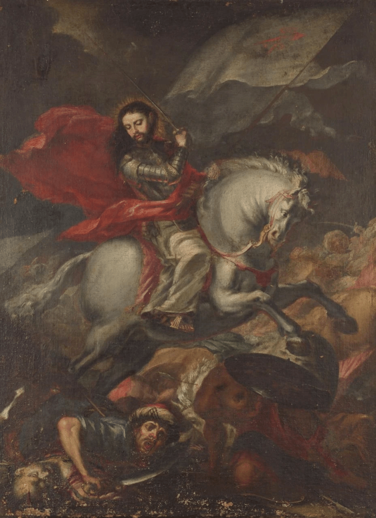 James the Great—known in Spain as Santiago—became one of the most powerful symbols of Spanish Christianity through the legend of the Battle of Clavijo, traditionally dated to 844. According to later medieval accounts, the apostle appeared on a white horse to aid Christian forces against Muslim armies, earning the title Santiago Matamoros (“Moor-slayer”). Although historians agree that the story emerged centuries after the supposed event and likely drew from later conflicts in the region of La Rioja, the image took on enormous symbolic weight during the Reconquista. Santiago was depicted as a mounted warrior, sword raised, banner bearing the red cross of the Order of Santiago, trampling defeated enemies beneath his horse. The icon fused spiritual patronage with military triumph and became inseparable from Spanish national identity.