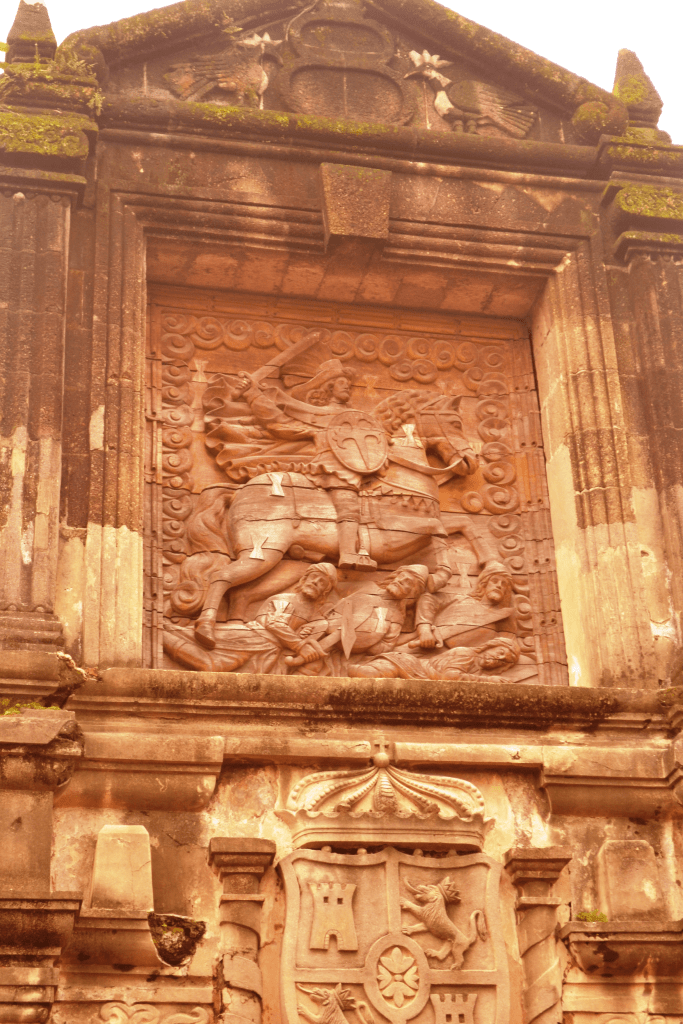 In Manila, the most prominent representation of Santiago Matamoros is the bas-relief installed on the façade of Fort Santiago in Intramuros. The fortress, constructed beginning in 1571 and named after the apostle, served as a defensive stronghold and later as a prison during Spanish rule. The relief of Santiago, positioned above the gate, asserted both religious patronage and imperial authority at the very entrance to the colonial citadel. Although the fort was heavily damaged during the 1945 Battle of Manila, the image was later restored; a replica carved in 1982 remains in place today.