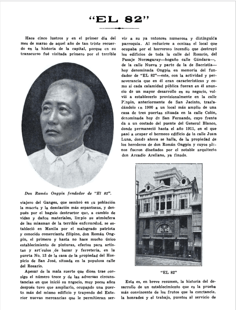 Despite the ill fortune said to accompany the number thirteen and the adverse conditions under which he began his business, only a few years later he was compelled to expand it, occupying an additional doorway in the same building and importing new goods from abroad that allowed him to serve his already numerous and distinguished clientele. When the premises he occupied were reduced to ashes by the dreadful fire that destroyed the buildings along Calle del Rosario, Pasaje Norzagaray—now Calle Gándara—Calle Nueva, and part of Calle de Sacristía—today called Ongpin in memory of the founder of “EL 82”—he, with the energy and perseverance characteristic of him, and as if each public calamity were a sign of greater growth for his business, reestablished it provisionally on Calle P. Pimpin, formerly San Jacinto, moving it in 1900 to a larger premises of a three-door house on Calle Colón, now called San Fernando, whose façade faces one side of the General Blanco Bridge. There it remained until 1911, when it moved to occupy the handsome building on Calle Juan Luna where it is now located, property of the heirs of Don Román Ongpin, and whose plans were designed by the notable architect Don Arcadio Arellano, now deceased.